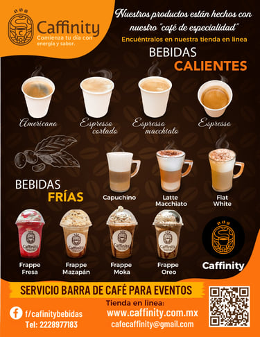 Servicio de barra de café profesional para eventos sociales y corporativos: bebidas calientes y frías hechas al momento con café de especialidad, desde espressos y cappuccinos hasta frappés. Reserva tu fecha y lleva la experiencia Caffinity a tu evento.
